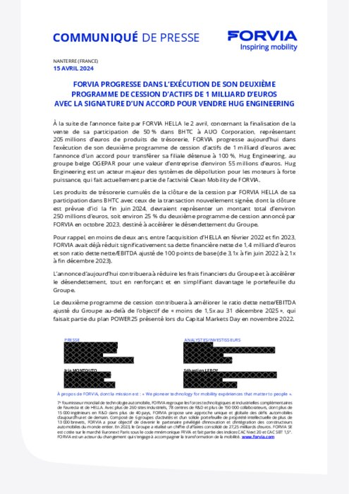À la suite de l’annonce faite par FORVIA HELLA le 2 avril, concernant la finalisation de la vente de sa participation de 50% dans BHTC à AUO Corporation, représentant 205millions d’euros de produits de trésorerie, FORVIA progresse aujourd’hui dans l’exécution de son deuxième programme de cession d’actifs de 1 milliard d’euros avec l’annonce d’un accord pour transférer sa filiale détenue à 100 %, Hug Engineering, au groupe belge OGEPAR pour une valeur d’entreprise d’environ 55 millions d’euros. Hug Engineering est un acteur majeur des systèmes de dépollution pour les moteurs à forte puissance, qui fait actuellement partie de l’activité Clean Mobility de FORVIA.