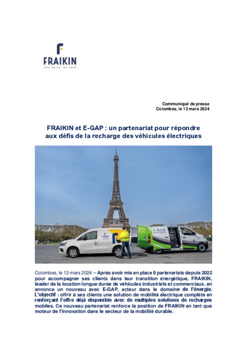 Après avoir mis en place 8 partenariats depuis 2022 pour accompagner ses clients dans leur transition énergétique, FRAIKIN, leader de la location longue durée de véhicules industriels et commerciaux, en annonce un nouveau avec E-GAP, acteur dans le domaine de l’énergie. L’objectif : offrir à ses clients une solution de mobilité électrique complète en renforçant l’offre déjà disponible avec de multiples solutions de recharges mobiles. Ce nouveau partenariat renforce la position de FRAIKIN en tant que moteur de l'innovation dans le secteur de la mobilité durable.