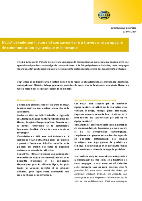 Hella dévoile son histoire et son savoir-faire à travers une campagne de communication dynamique et innovante. L'équipementier a en effet lancé en fin d’année dernière une campagne de communication sur les réseaux sociaux, avec une approche unique dans sa stratégie de communication : à la fois polyvalente et inclusive, cette campagne répond en effet aux besoins et aux intérêts des clients professionnels comme des consommateurs finaux.