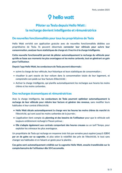Hello Watt dévoile aujourd’hui une nouvelle étape dans le pilotage intelligent de l’énergie : les propriétaires de Tesla peuvent désormais connecter leur véhicule à l’application Hello Watt pour suivre, analyser et optimiser automatiquement leurs recharges, tout en générant des revenus.