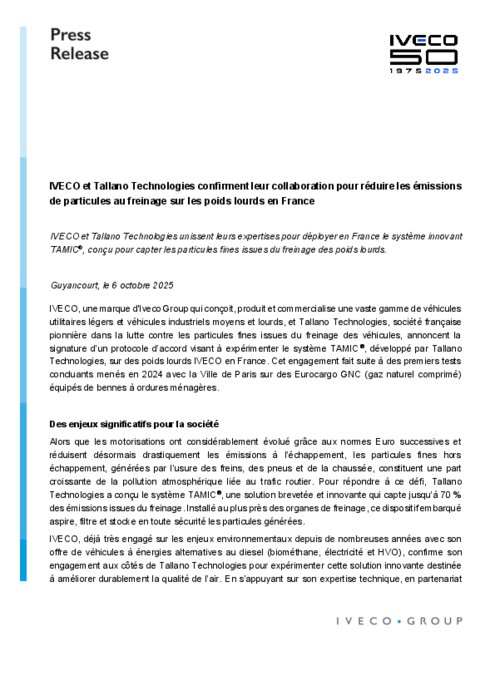 IVECO, une marque d'Iveco Group qui conçoit, produit et commercialise une vaste gamme de véhicules utilitaires légers et véhicules industriels moyens et lourds, et Tallano Technologies, société française pionnière dans la lutte contre les particules fines issues du freinage des véhicules, annoncent la signature d’un protocole d’accord visant à expérimenter le système TAMIC®, développé par Tallano Technologies, sur des poids lourds IVECO en France. Cet engagement fait suite à des premiers tests concluants menés en 2024 avec la Ville de Paris sur des Eurocargo GNC (gaz naturel comprimé) équipés de bennes à ordures ménagères.