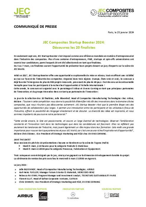 En seulement sept ans, JEC Startup Booster s'est imposé comme une référence mondiale en matière d'entrepreneuriat dans l'industrie des composites. Plus d’une centaine d'entrepreneurs, PME, startups et spin-offs universitaires ont soumis leur candidature, parmi lesquels 20 ont été sélectionnés en tant que finalistes. Du 5 au 7 mars, ces finalistes auront l'opportunité de présenter leurs projets devant un jury d’experts sur la scène de JEC World.
