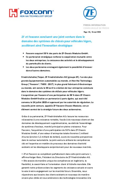 Foxconn acquiert 50 % des parts de ZF Chassis Modules GmbH. Ce partenariat stratégique renforce la coopération mutuelle entre les deux entreprises, la croissance des activités et le développement du portefeuille de clients. Les deux partenaires envisagent également la possibilité d'innover dans d'autres domaines.