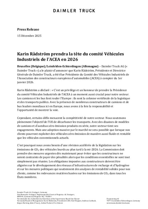 Daimler Truck AG («Daimler Truck ») a le plaisir d'annoncer que Karin Rådström, Présidente et Directrice Générale de Daimler Truck, a été élue Présidente du Comité des Véhicules Industriels de l'Association des constructeurs européens d'automobiles (ACEA) à compter du 1er janvier 2026.