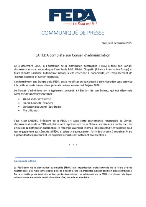 Le 4 décembre 2025, la Fédération de la distribution automobile (FEDA) a tenu son Conseil d’administration au cours duquel l’entrée de MM. Albéric Chopelin (Alliance Automotive Group) et Marc Ripotot (Alliance Automotive Group) a été entérinée à l’unanimité, en remplacement de Thomas Tabiasco et Olivier Vejdovsky.