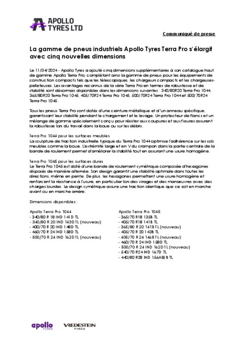 Apollo Tyres a ajouté cinq dimensions supplémentaires à son catalogue haut de gamme Apollo Terra Pro, complétant ainsi la gamme de pneus pour les engins de construction compacts tels que les télescopiques, les chargeurs compacts et les chargeuses-pelleteuses.