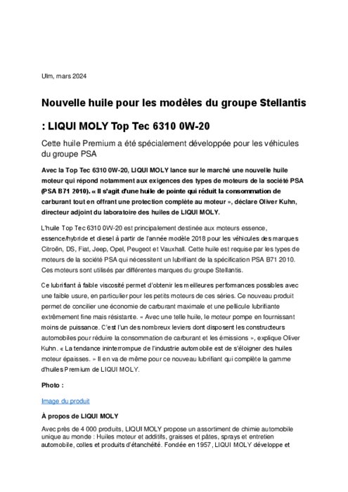 Avec la Top Tec 6310 0W-20, LIQUI MOLY lance sur le marché une nouvelle huile moteur qui répond notamment aux exigences des types de moteurs de la société PSA (PSA B71 2010). « Il s’agit d’une huile de pointe qui réduit la consommation de carburant tout en offrant une protection complète au moteur », déclare Oliver Kuhn, directeur adjoint du laboratoire des huiles de LIQUI MOLY.