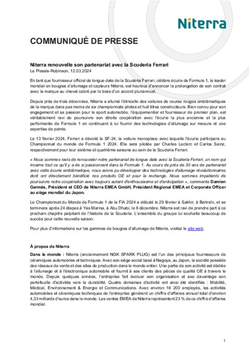 En tant que fournisseur officiel de longue date de la Scuderia Ferrari, célèbre écurie de Formule 1, le leader mondial en bougies d'allumage et capteurs Niterra, est heureux d'annoncer la prolongation de son contrat avec la marque au cheval cabré par le biais d'un accord pluriannuel.