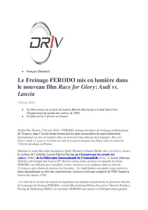 FERODO, marque de pièces de freinage emblématique de Tenneco, dans l’un des bouleversements les plus mémorables du sport automobile international est mis en lumière dans un nouveau long métrage de Lionsgate, Race for Glory: Audi vs. Lancia. Ce film est sorti le 4 janvier dernier aux États-Unis et sortira le 7 février prochain en France.