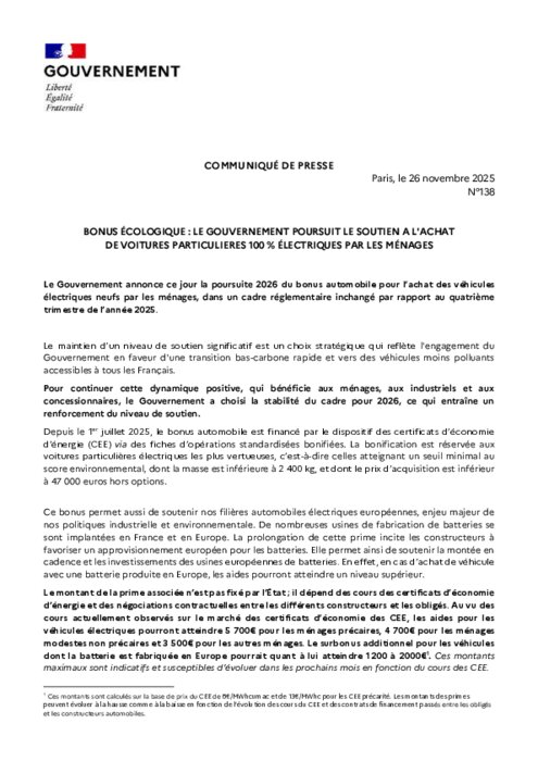 Services 26 novembre 2025 - 17:06 Le maintien d’un niveau de soutien significatif est un choix stratégique qui reflète l'engagement du Gouvernement en faveur d'une transition bas-carbone rapide et vers des véhicules moins polluants accessibles à tous les Français. PDF (100 Ko) Télécharger credit Logo officiel Gouvernement