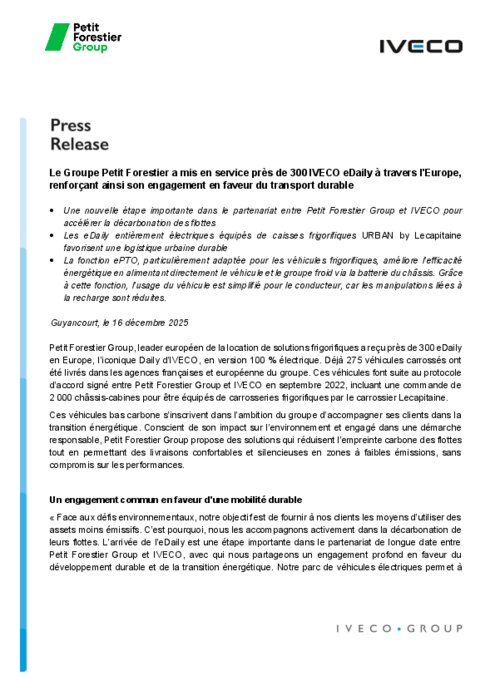 Petit Forestier Group, leader européen de la location de solutions frigorifiques a reçu près de 300 eDaily en Europe, l’iconique Daily d’IVECO, en version 100 % électrique. Déjà 275 véhicules carrossés ont été livrés dans les agences françaises et européenne du groupe. Ces véhicules font suite au protocole d’accord signé entre Petit Forestier Group et IVECO en septembre 2022, incluant une commande de 2 000 châssis-cabines pour être équipés de carrosseries frigorifiques par le carrossier Lecapitaine.