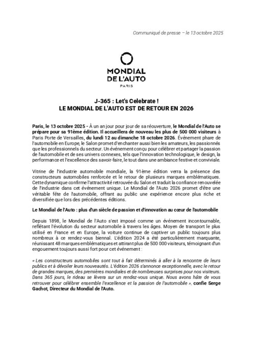 À un an jour pour jour de sa réouverture, le Mondial de l'Auto se prépare pour sa 91ème édition. Il accueillera de nouveau les plus de 500 000 visiteurs à Paris Porte de Versailles, du lundi 12 au dimanche 18 octobre 2026. Événement phare de l'automobile en Europe, le Salon promet d'enchanter aussi bien les amateurs, les passionnés que les professionnels du secteur. Un événement conçu pour célébrer et partager la passion de l'automobile et de ses univers connexes, tels que l’innovation technologique, le design, la performance et l’excellence des savoir-faire, le tout dans une ambiance festive et conviviale