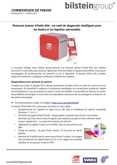 A l’occasion d’Equip Auto, bilstein group présente son nouveau testeur d’huile febi, une solution innovante et universelle pour analyser rapidement l’état des huiles et liquides automobiles. Conçu pour accompagner les professionnels de l’entretien et de la réparation, le testeur d’huile febi combine simplicité d’utilisation, intelligence artificielle et fiabilité des résultats.