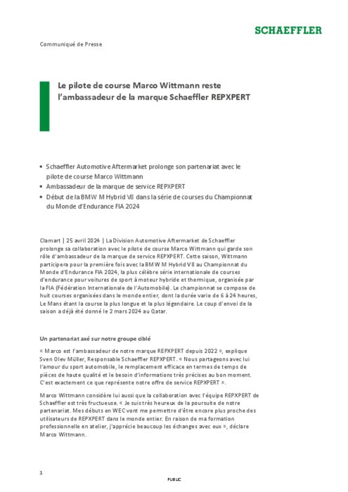 La Division Automotive Aftermarket de Schaeffler prolonge sa collaboration avec le pilote de course Marco Wittmann qui garde son rôle d’ambassadeur de la marque de service REPXPERT. Cette saison, Wittmann participera pour la première fois avec la BMW M Hybrid V8 au Championnat du Monde d’Endurance FIA 2024, la plus célèbre série internationale de courses d'endurance pour voitures de sport à moteur hybride et thermique, organisée par la FIA.