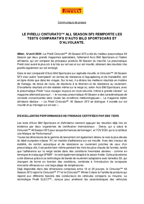 Le Pirelli Cinturato All Season SF3 a été élu meilleur pneumatique All Season par deux grands magazines spécialisés, l'allemand Auto Bild Sportscars et l'italien alVolante, qui ont comparé les principaux produits All Season du marché. Le pneumatique Pirelli s'est avéré le plus sûr à la fois sur sol sec et sur sol mouillé, obtenant des résultats très positifs également sur sol enneigé.
