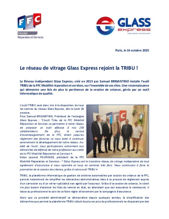 Le Réseau indépendant Glass Express, créé en 2013 par Samuel BRIGANTINO installe l’outil TRIBU de la FFC Mobilité réparation et services, sur l’ensemble de ses sites. Une reconnaissance qui démontre une fois de plus la pertinence de la cession de créance, gérée par un outil informatique de qualité.