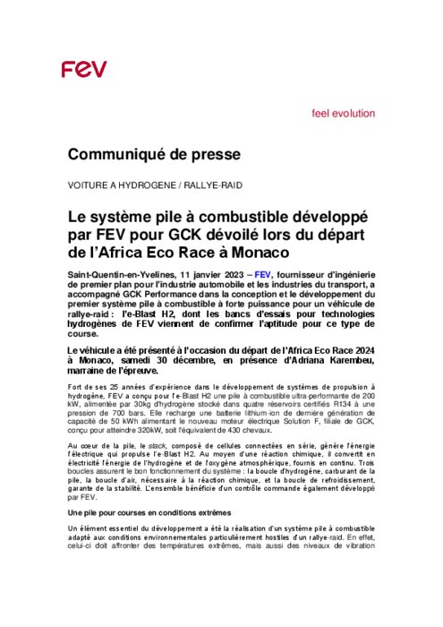FEV, fournisseur d'ingénierie de premier plan pour l'industrie automobile et les industries du transport, a accompagné GCK Performance dans la conception et le développement du premier système pile à combustible à forte puissance pour un véhicule de rallye-raid : l’e-Blast H2, dont les bancs d’essais pour technologies hydrogènes de FEV viennent de confirmer l’aptitude pour ce type de course.