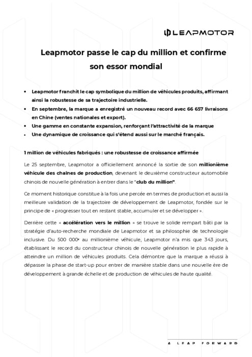 Leapmotor franchit le cap symbolique du million de véhicules produits, affirmant ainsi la robustesse de sa trajectoire industrielle. En septembre, la marque a enregistré un nouveau record avec 66 657 livraisons en Chine (ventes nationales et export). Une gamme en constante expansion, renforçant l’attractivité de la marque. Une dynamique de croissance qui s’étend aussi sur le marché français.