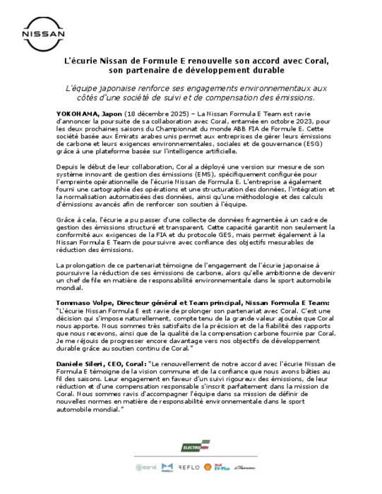 La Nissan Formula E Team est ravie d'annoncer la poursuite de sa collaboration avec Coral, entamée en octobre 2023, pour les deux prochaines saisons du Championnat du monde ABB FIA de Formule E. Cette société basée aux Émirats arabes unis permet aux entreprises de gérer leurs émissions de carbone et leurs exigences environnementales, sociales et de gouvernance (ESG) grâce à une plateforme basée sur l'intelligence artificielle.