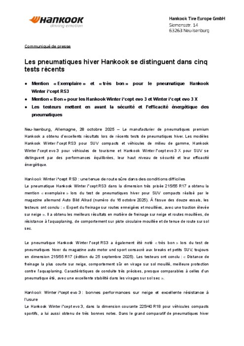 Le manufacturier de pneumatiques premium Hankook a obtenu d’excellents résultats lors de récents tests de pneumatiques hiver. Les modèles Hankook Winter i*cept RS3 pour SUV compacts et véhicules de milieu de gamme, Hankook Winter i*cept evo 3 pour véhicules de tourisme et Hankook Winter i*cept evo 3 X pour SUV se distinguent par des performances équilibrées, leur haut niveau de sécurité et leur efficacité énergétique.