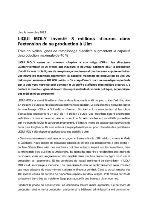 LIQUI MOLY ouvre un nouveau chapitre à son siège d’Ulm : les directeurs Günter Hiermaier et Uli Weller ont inauguré le nouveau bâtiment pour la production d’additifs avec trois lignes de remplissage modernes et des bureaux supplémentaires. Les nouvelles machines augmentent la capacité maximale de production de 346 000 bidons par semaine à 481 000 unités.