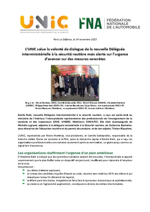 Estelle Balit, nouvelle Déléguée interministérielle à la sécurité routière, a reçu hier après-midi au ministère de l’Intérieur l’intersyndicale représentative des professionnels de l’enseignement de la conduite et des inspecteurs (UNIC, UNIDEC, Mobilians, SNICA-FO). Elle était accompagnée de Michèle Lugrand, adjointe à la déléguée ministérielle à la Sécurité routière, de Catherine Bachelier, sous-directrice de l’éducation routière et du permis de conduire, et de son adjoint, Tristan Riquelme.