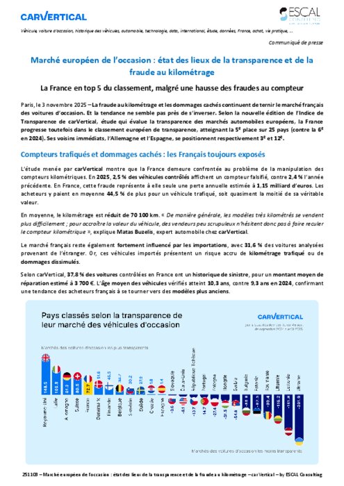 La fraude au kilométrage et les dommages cachés continuent de ternir le marché français des voitures d’occasion. Selon la nouvelle édition de l’Indice de Transparence de carVertical, étude qui évalue la transparence des marchés automobiles européens, la France progresse dans le classement européen de transparence, atteignant la 5ᵉ place sur 25 pays (contre la 6ᵉ en 2024). Ses voisins immédiats, l’Allemagne et l’Espagne, se positionnent respectivement 3ᵉ et 12ᵉ.