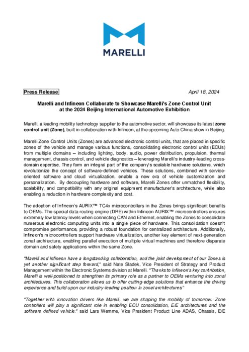 Marelli, l'un des principaux fournisseurs de technologies de mobilité pour le secteur automobile, présentera sa dernière unité de contrôle de zone (Zone), construite en collaboration avec Infineon, lors du prochain salon Auto China à Pékin.