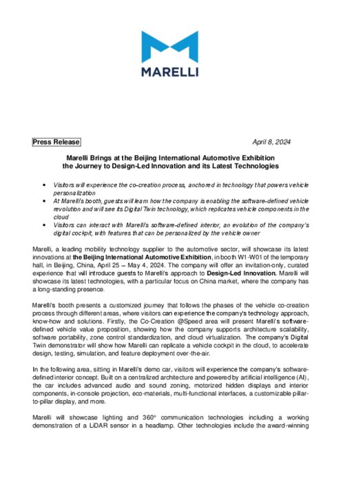 Marelli, l'un des principaux fournisseurs de technologies de mobilité pour le secteur automobile, présentera ses dernières innovations au Salon international de l'automobile de Pékin, sur le stand W1-W01 du hall temporaire, à Pékin, en Chine, du 25 avril au 4 mai 2024. L'entreprise proposez une expérience organisée sur invitation uniquement qui présentera aux invités l'approche de Marelli en matière d'innovation axée sur le design.