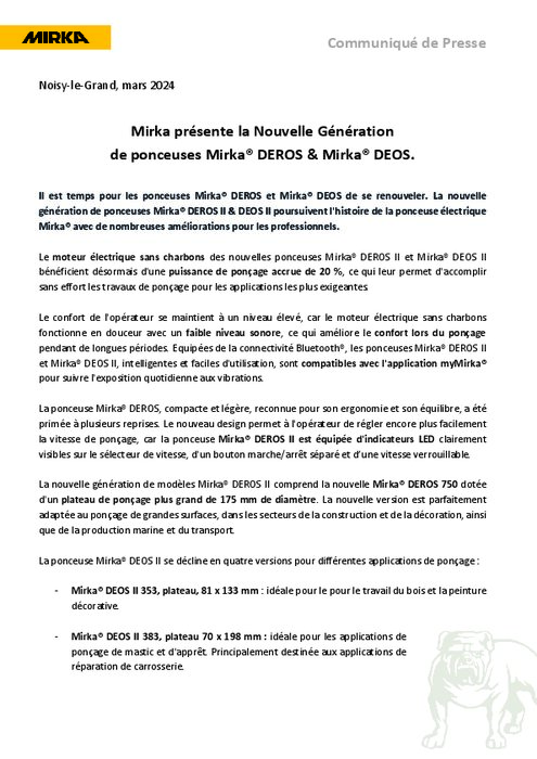 Equipementiers 19 mars 2024 - 14:15 Il est temps pour les ponceuses Mirka DEROS et Mirka DEOS de se renouveler. La nouvelle génération de ponceuses Mirka DEROS II & DEOS II poursuivent l'histoire de la ponceuse électrique Mirka avec de nombreuses améliorations pour les professionnels. PDF (158 Ko) Télécharger Crédits : Mirka