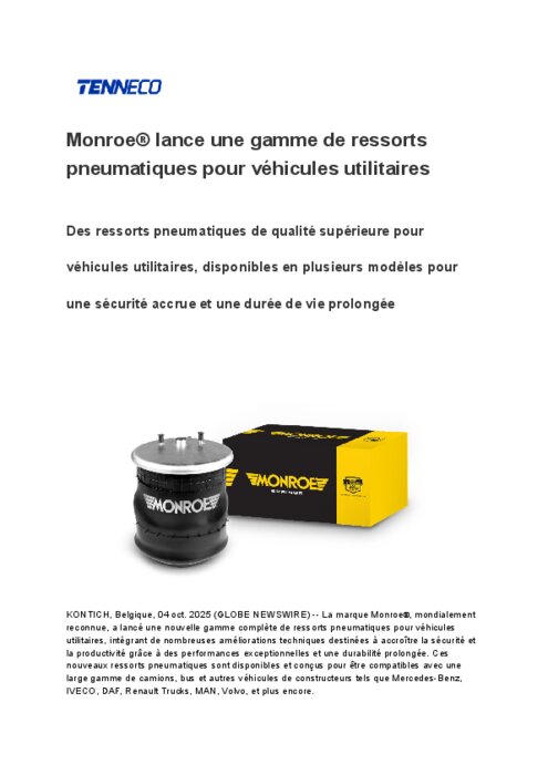 La marque Monroe a lancé une nouvelle gamme complète de ressorts pneumatiques pour véhicules utilitaires, intégrant de nombreuses améliorations techniques destinées à accroître la sécurité et la productivité grâce à des performances exceptionnelles et une durabilité prolongée. Ces nouveaux ressorts pneumatiques sont disponibles et conçus pour être compatibles avec une large gamme de camions, bus et autres véhicules de constructeurs tels que Mercedes-Benz, IVECO, DAF, Renault Trucks, MAN, Volvo, et plus encore.