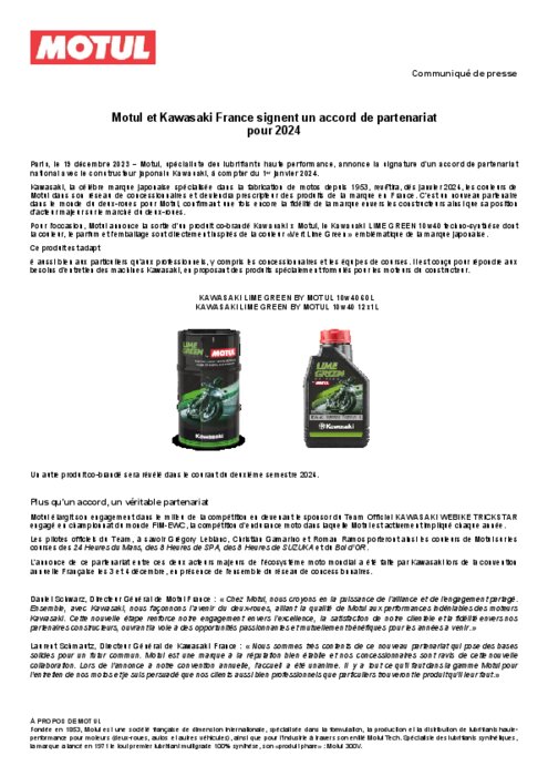 Pour l’occasion, Motul annonce la sortie d’un produit co-brandé Kawasaki x Motul, le Kawasaki LIME GREEN 10w40 techno-synthèse dont la couleur, le parfum et l’emballage sont directement inspirés de la couleur «Vert Lime Green » emblématique de la marque japonaise.