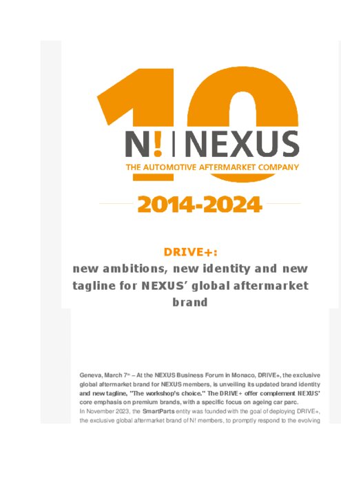 Lors du NEXUS Business Forum à Monaco, DRIVE+, la marque mondiale exclusive de pièces de rechange pour les membres NEXUS, dévoile son identité de marque mise à jour et son nouveau slogan, « Le choix de l'atelier ». L'offre DRIVE+ complète l'accent mis par NEXUS sur les marques haut de gamme, avec un accent particulier sur le parc automobile vieillissant.