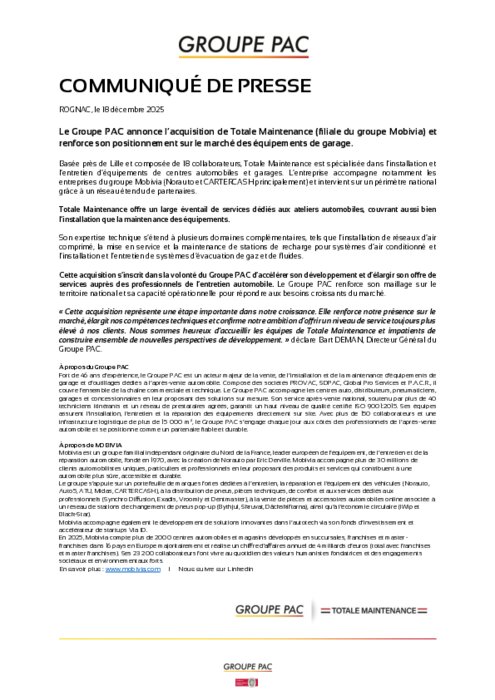 Equipementiers, Réparateurs 18 décembre 2025 - 15:58 Cette opération permet au Groupe PAC de renforcer son positionnement sur le marché des équipements de garage et d’élargir son offre de services auprès des professionnels de l’après-vente automobile. PDF (129 Ko) Télécharger credit Totale Maintenance