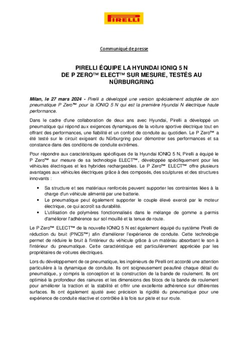 Dans le cadre d'une collaboration de deux ans avec Hyundai, Pirelli a développé un pneumatique qui répond aux exigences dynamiques de la voiture sportive électrique tout en offrant des performances, une fiabilité et un confort de conduite au quotidien. Le P Zero a été testé sur le circuit exigeant du Nürburgring pour démontrer ses performances et sa constance dans des conditions de conduite extrêmes.