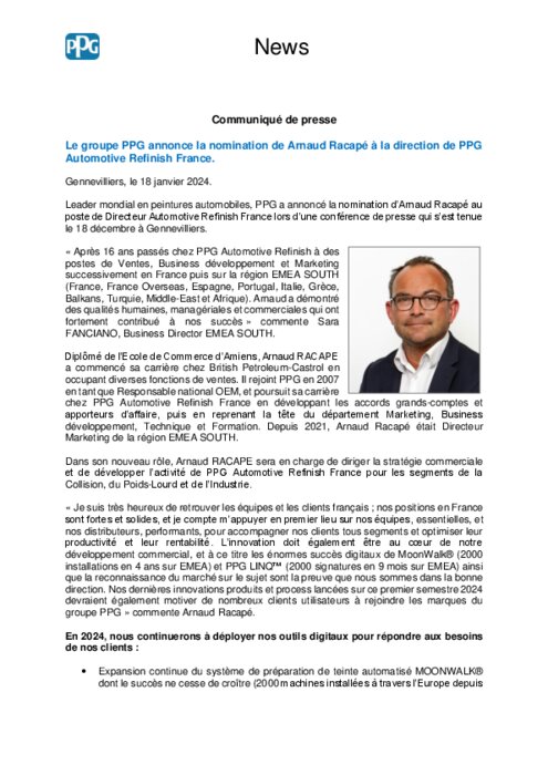 Equipementiers 22 janvier 2024 - 10:28 Leader mondial en peintures automobiles, PPG a annoncé la nomination d’Arnaud Racapé au poste de Directeur Automotive Refinish France lors d’une conférence de presse qui s’est tenue le 18 décembre à Gennevilliers. PDF (140 Ko) Télécharger