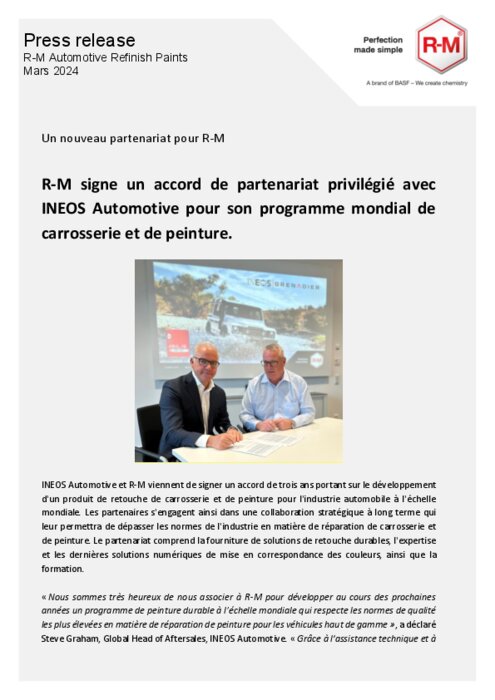 INEOS Automotive et R-M viennent de signer un accord de trois ans portant sur le développement d'un produit de retouche de carrosserie et de peinture pour l'industrie automobile à l'échelle mondiale. Les partenaires s'engagent ainsi dans une collaboration stratégique à long terme qui leur permettra de dépasser les normes de l'industrie en matière de réparation de carrosserie et de peinture.