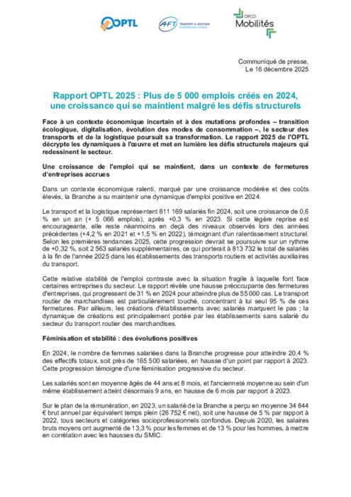 Face à un contexte économique incertain et à des mutations profondes – transition écologique, digitalisation, évolution des modes de consommation –, le secteur des transports et de la logistique poursuit sa transformation. Le rapport 2025 de l'OPTL décrypte les dynamiques à l'œuvre et met en lumière les défis structurels majeurs qui redessinent le secteur.