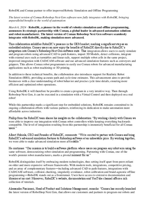 Equipementiers 06 mars 2024 - 15:51 La synergie entre ces deux sociétés a donné naissance à la dernière version du logiciel Roboshop Next Gen de Comau qui s'intègre totalement à RoboDK, offrant ainsi des améliorations en matière de simulation dans le monde de l'automatisation. PDF (93 Ko) Télécharger Crédits : RoboDK