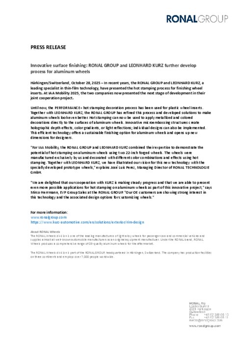 Ces dernières années, le groupe RONAL et LEONHARD KURZ, spécialiste de premier plan dans le domaine de la technologie des couches minces, ont présenté le procédé d'estampage à chaud pour la finition des inserts de roues. Lors du salon IAA Mobility 2025, les deux entreprises ont désormais présenté la prochaine étape de développement de leur projet de coopération commun.