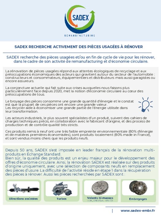 Equipementiers 02 mai 2024 - 11:15 Sadex recherche des pièces usagées et/ou en fin de cycle de vie pour les rénover, dans le cadre de son activité de remanufacturing et d'économie circulaire. PDF (143 Ko) Télécharger