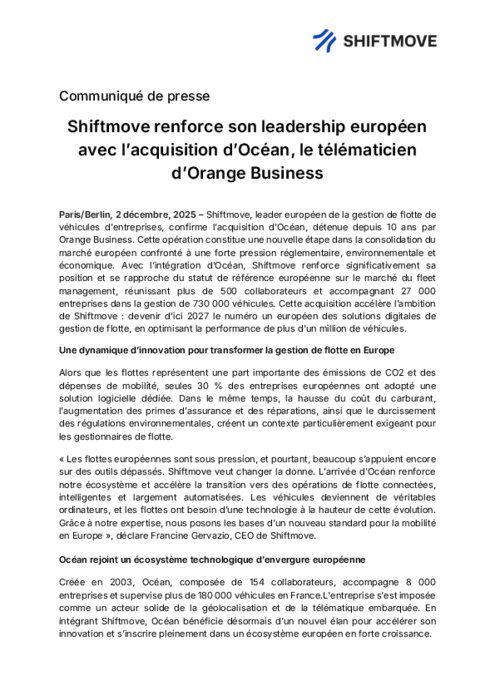 Shiftmove, leader européen de la gestion de flotte de véhicules d’entreprises, confirme l’acquisition d’Océan, détenue depuis 10 ans par Orange Business. Cette opération constitue une nouvelle étape dans la consolidation du marché européen confronté à une forte pression réglementaire, environnementale et économique.