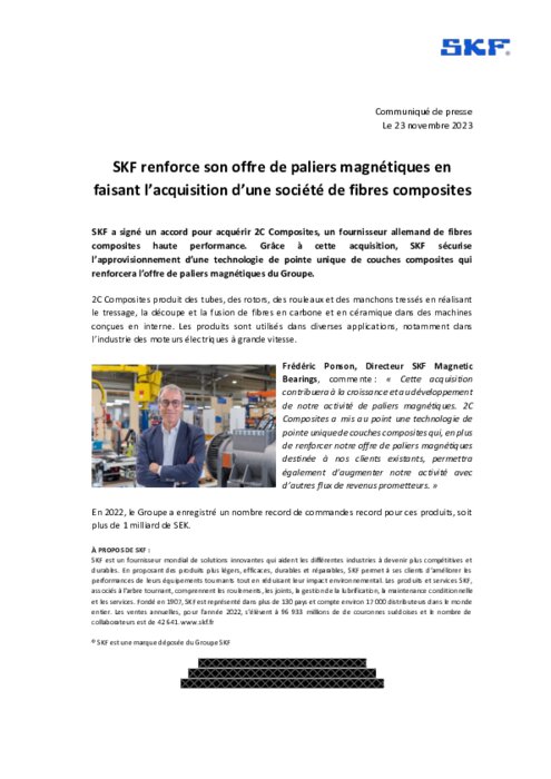 SKF a signé un accord pour acquérir 2C Composites, un fournisseur allemand de fibres composites haute performance. Grâce à cette acquisition, SKF sécurise l’approvisionnement d’une technologie de pointe unique de couches composites qui renforcera l’offre de paliers magnétiques du Groupe.