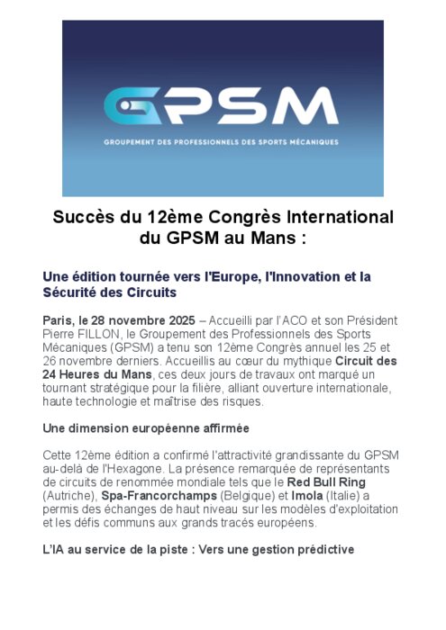 Accueilli par l’ACO et son Président Pierre FILLON, le Groupement des Professionnels des Sports Mécaniques (GPSM) a tenu son 12ème Congrès annuel les 25 et 26 novembre derniers. Accueillis au cœur du mythique Circuit des 24 Heures du Mans, ces deux jours de travaux ont marqué un tournant stratégique pour la filière, alliant ouverture internationale, haute technologie et maîtrise des risques.