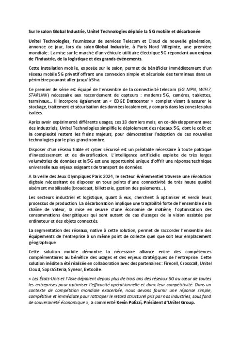 Unitel Technologies, fournisseur de services Telecom et Cloud de nouvelle génération, annonce ce jour, lors du salon Global Industrie, à Paris Nord Villepinte, une première mondiale : La mise sur le marché d’un véhicule utilitaire électrique 5G répondant aux enjeux de l’industrie, de la logistique et des grands événements.