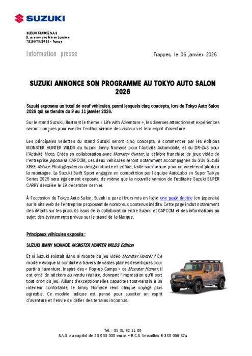 Les principales vedettes du stand Suzuki seront cinq concepts, à commencer par les éditions Monster Hunter Wilds du Suzuki Jimny Nomade pour l'Activité Automobile, et du DR-Z4S pour l'Activité Moto. Créés en collaboration avec Monster Hunter, la célèbre franchise de jeux vidéo de l'entreprise japonaise Capcom, ces deux véhicules seront notamment accompagnés du SUV Suzuki XBee Nature Photographerau design robuste et raffiné, taillé sur-mesure pour un week-end photo à la montagne. La Suzuki Swift Sport engagée en compétition par l'équipe AutoLabo en Super Taikyu Series 2025 sera également exposée, de même que la nouvelle version de l'utilitaire Suzuki Super Carry dévoilée le 19 décembre dernier.