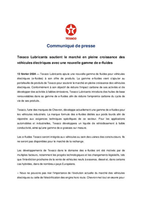 Texaco, l’une des marques de Chevron, développe actuellement une gamme de e-fluides pour les véhicules industriels. La marque formule des e-fluides dédiés aux poids lourds afin de répondre aux exigences techniques spécifiques de ce secteur. Pour les applications automobiles et industrielles, Texaco développera un liquide de refroidissement à faible conductivité, ainsi qu’une gamme de e-graisses sur mesure.