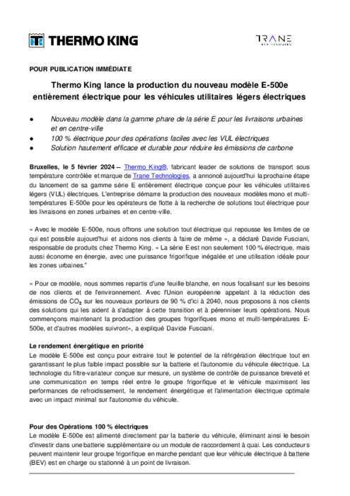 Thermo King, fabricant leader de solutions de transport sous température contrôlée et marque de Trane Technologies, a annoncé aujourd'hui la prochaine étape du lancement de sa gamme série E entièrement électrique conçue pour les véhicules utilitaires légers (VUL) électriques. L'entreprise démarre la production des nouveaux modèles mono et multi-températures E-500e pour les opérateurs de flotte à la recherche de solutions tout électrique pour les livraisons en zones urbaines et en centre-ville.