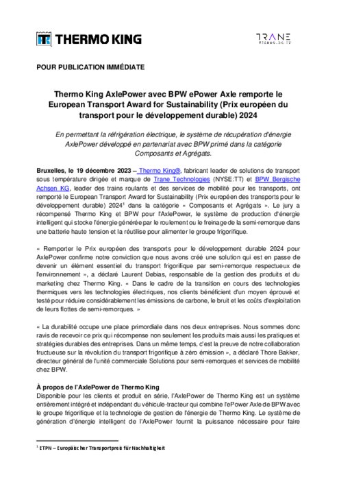 Thermo King, fabricant leader de solutions de transport sous température dirigée et marque de Trane Technologies et BPW Bergische Achsen KG, leader des trains roulants et des services de mobilité pour les transports, ont remporté le European Transport Award for Sustainability (Prix européen des transports pour le développement durable) 20241 dans la catégorie « Composants et Agrégats ».