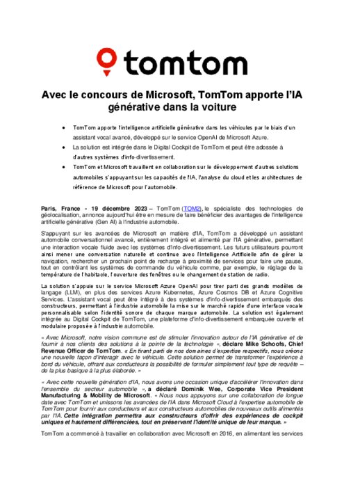 Equipementiers 19 décembre 2023 - 10:41 TomTom (TOM2), le spécialiste des technologies de géolocalisation, annonce aujourd'hui être en mesure de faire bénéficier des avantages de l'intelligence artificielle générative (Gen AI) à l'industrie automobile. PDF (157 Ko) Télécharger